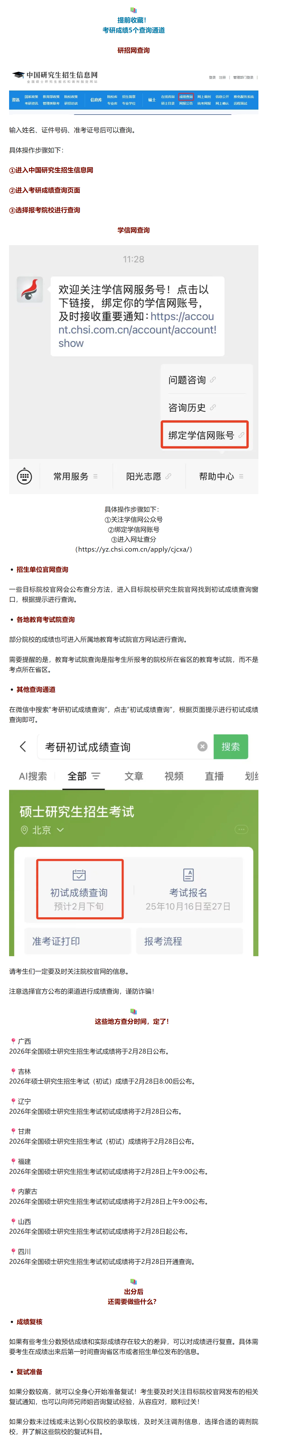 从多地教育部门获悉,各研究生招生单位已基本完成2026年全国硕士研究生招生考试初试阅卷工作,将于2月28日起陆续向考生开通成绩查询渠道。请考生密切关注招生单位官方信息,通过官方指定渠道查成绩。