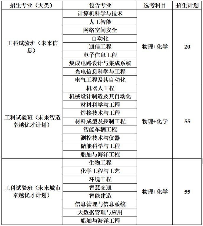 我校2026年在山东省综合评价招生计划为130人,招生专业(大类)为工科试验班(未来信息)、工科试验班(未来智造卓越优才计划)、工科试验班(未来城市卓越优才计划),详见下表:
