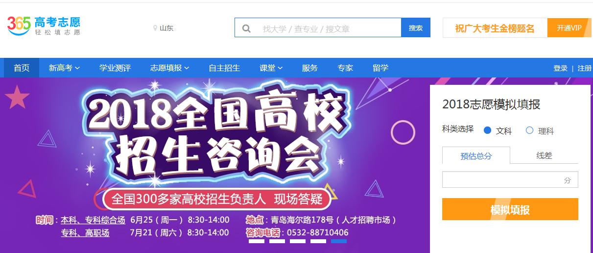 2018年高考招生政策有什么变化?考生应该如何填报志愿?各个学校的招生政策有哪些?有什么报考条件?由山东省教育招生考试院、青岛市招生考试办公室指导,青岛早报、365高考志愿平台主办,青岛豪杰传媒有限公司承办的“2018全国高校招生咨询会”综合场将于6月25日在青岛海尔路178号青岛市人才交流服务中心隆重举行,这也是高考成绩公布后在青岛举行的首场高校招生咨询会。