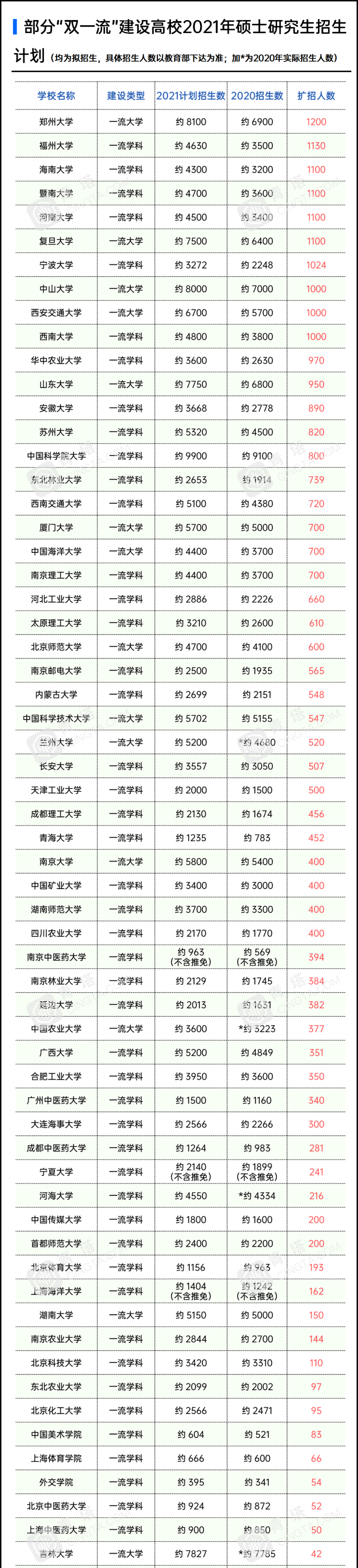 以下数据为人工统计,如有疏漏欢迎在评论区指正。需要注意的是,本文中所有高校2021年招生计划均为拟招生人数,具体招生人数以教育部下达计划为准;2020硕士研究生招生人数优先采用各大高校公布的2020年新生数据,以符号“*”进行标注,未标注的为2020年计划招生数。数据仅供参考,最终人数以高校公布为准。