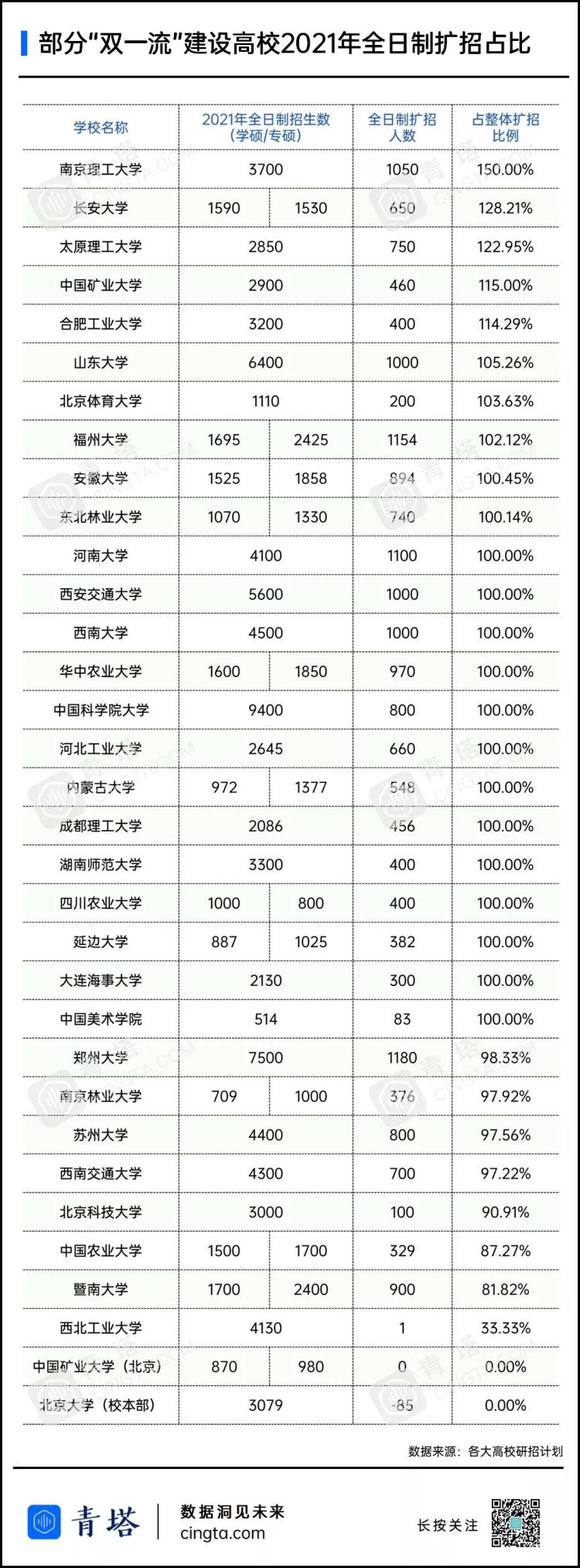 从超过30所的“双一流”建设高校招生计划的明细数据来看,全日制硕士研究生的扩招人数占整体扩招规模的比例相当高,部分高校甚至出现非全日制缩招,全日制扩招的情况。